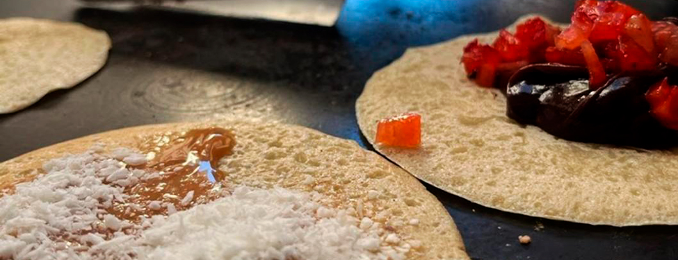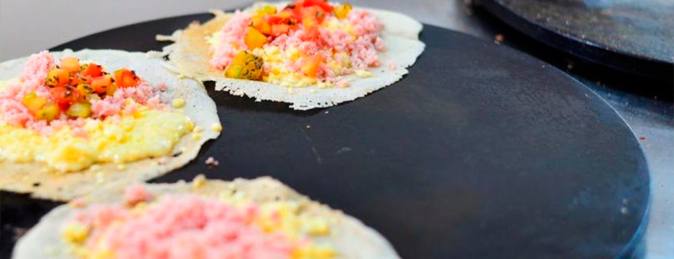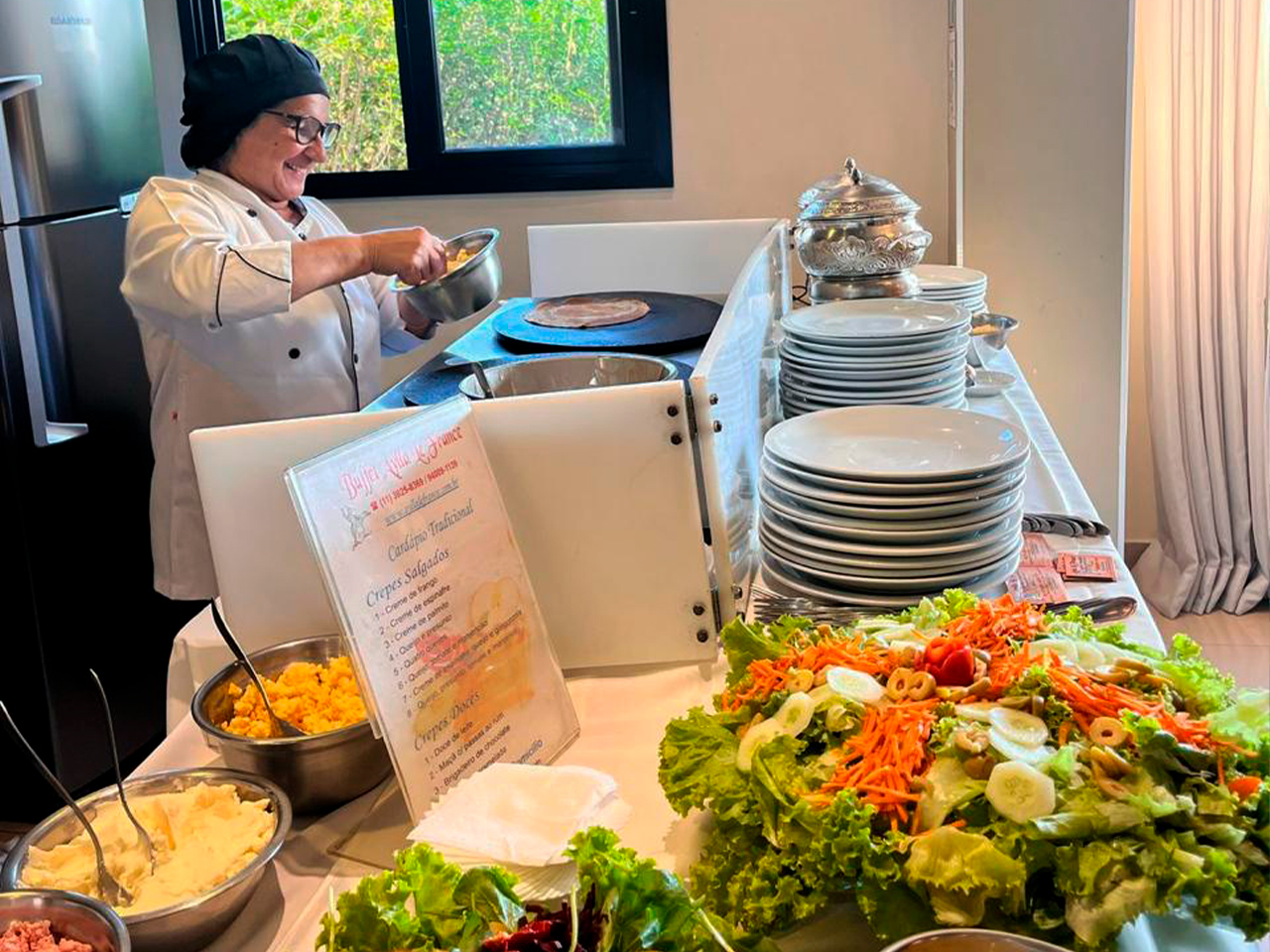 Chapas, mesa principal, toalha de mesa, pratos de porcelana branco liso, talhares de inox, guardanapos, réchaud para manter quentes os molhos, copos, material de limpeza, cardápio.